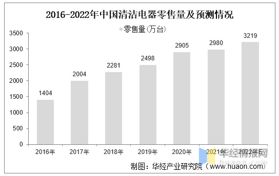 根據華經產業研究院數據顯示,2016年至2021年,我國清潔電器市場規模由約101億元提升至309億元,期間年復合增長率為25.06%;零售量從1404萬臺,增長至2980萬臺,預計2022年零售量將超過3000萬臺。中國清潔電器市場方興未艾,前景廣闊。