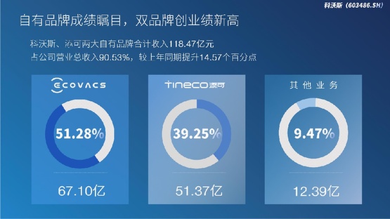 盈利能力顯著增強的背后,離不開其自主品牌業(yè)務(wù)“量價齊升”的靚麗表現(xiàn),2021年科沃斯兩大自主品牌合計業(yè)務(wù)收入占比達90.53%,同比提升14.57個百分點,兩大業(yè)務(wù)也繼續(xù)在各自領(lǐng)域中鞏固行業(yè)龍頭地位。