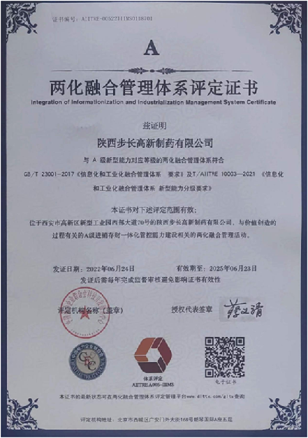 步長高新為積極響應國家全面推廣信息化和工業化融合管理體系標準的政策,提升管理效率帶動企業技術,產品與管理創新,提高企業核心競爭優勢,通過對公司過程管理來持續打造企業信息化環境下新型能力,同時更好將信息化融入企業管理中,于2021年05月順利召開了兩化融合管理體系貫標啟動會,成立了兩化融合推行領導小組和工作小組。通過深入學習領會,按照GB/T23001-2017《信息化和工業化融合管理體系要求》及T/AIITRE10003-2021《信息化和工業化融合管理體系新型能力分級要求》最終完成兩化融合管理體系的文件編制與修訂、運行、內部審核、管理評審等工作。經逐級申報由西安市工業和信息化局最終審核通過,于2021年09月成功入選為西安市級兩化融合管理體系貫標試點企業。2022年04月通過了專家審核組的現場審核,經國家兩化融合評定委員會評定,順利通過以打造“與價值創造的過程有關的A級進銷存財一體化管控能力建設”為兩化融合管理活動目標的認證工作。