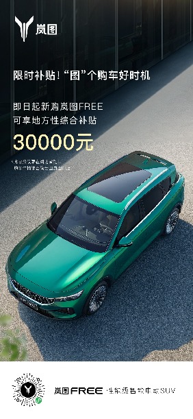 限時補貼來襲。2022年8月1日起,在湖北省開票下定嵐圖FREE,可享地方政府綜合性現金補貼30000元。額度有限,先到先得。(推廣)