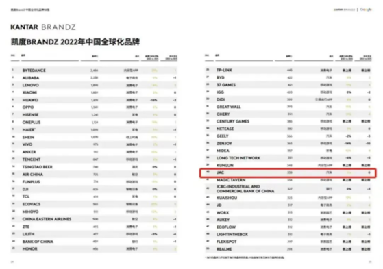 作為最早布局海外市場的中國汽車品牌之一,江汽集團(tuán)堅(jiān)定“走出去”的步伐,積極響應(yīng)“一帶一路”倡議,加大海外市場開拓力度,進(jìn)一步推動(dòng)公司國際業(yè)務(wù)持續(xù)向上向好,JAC品牌的世界影響力日益增強(qiáng),底色更亮、成色更足。江汽集團(tuán)位列Brand Z中國全球化品牌第40位,中國汽車品牌第5位。