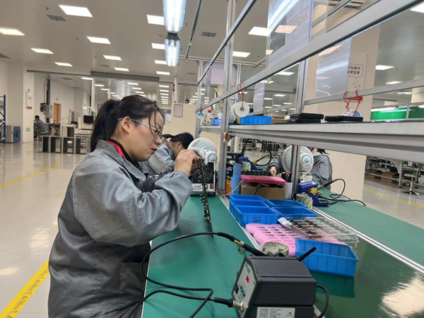 在國盾量子生產(chǎn)基地的高低溫環(huán)境實驗室內,量子通信設備正在進行整機運行測試。在零部件生產(chǎn)和整機組裝測試生產(chǎn)線上,技術人員正在對電路板進行單板焊接操作和對產(chǎn)品進行檢測標定。