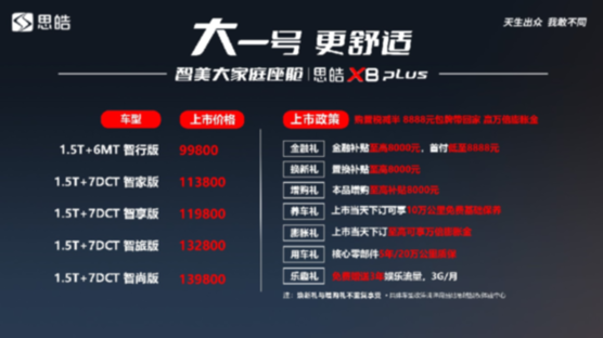 思皓X8 PLUS共5款車型,官方指導價9.98萬元-13.98萬元,并尊享多重大禮:訂車可享受至高8000元金融補貼、至高8000元增換購補貼、核心零部件5年或20萬公里質保、3年免費娛樂流量(3G/月)、上市當天下訂可享10萬公里免費基礎保養和至高萬倍膨脹金等,誠意十足,讓廣大用戶悅享高品質舒適出行。