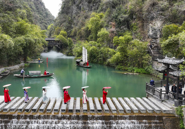 3月28日,工作人員在湖北省宜昌市夷陵區三峽人家風景區進行《船工號子》民俗表演(無人機照片)。