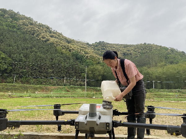 黎穎鈞正在給植保無人機(jī)補(bǔ)充藥液。(受訪者供圖)