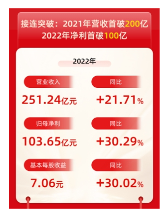 2022年,企業營收再創歷史新高,繼2021年營收首破200億后,2022年企業凈利首破100億。不斷刷新的發展成績,接連的發展突破,為其高質量發展再添力證。