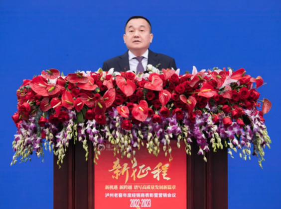 圖為瀘州老窖集團及股份公司黨委書記、董事長劉淼在2022-2023瀘州老窖年度經銷商表彰暨營銷會議上發言