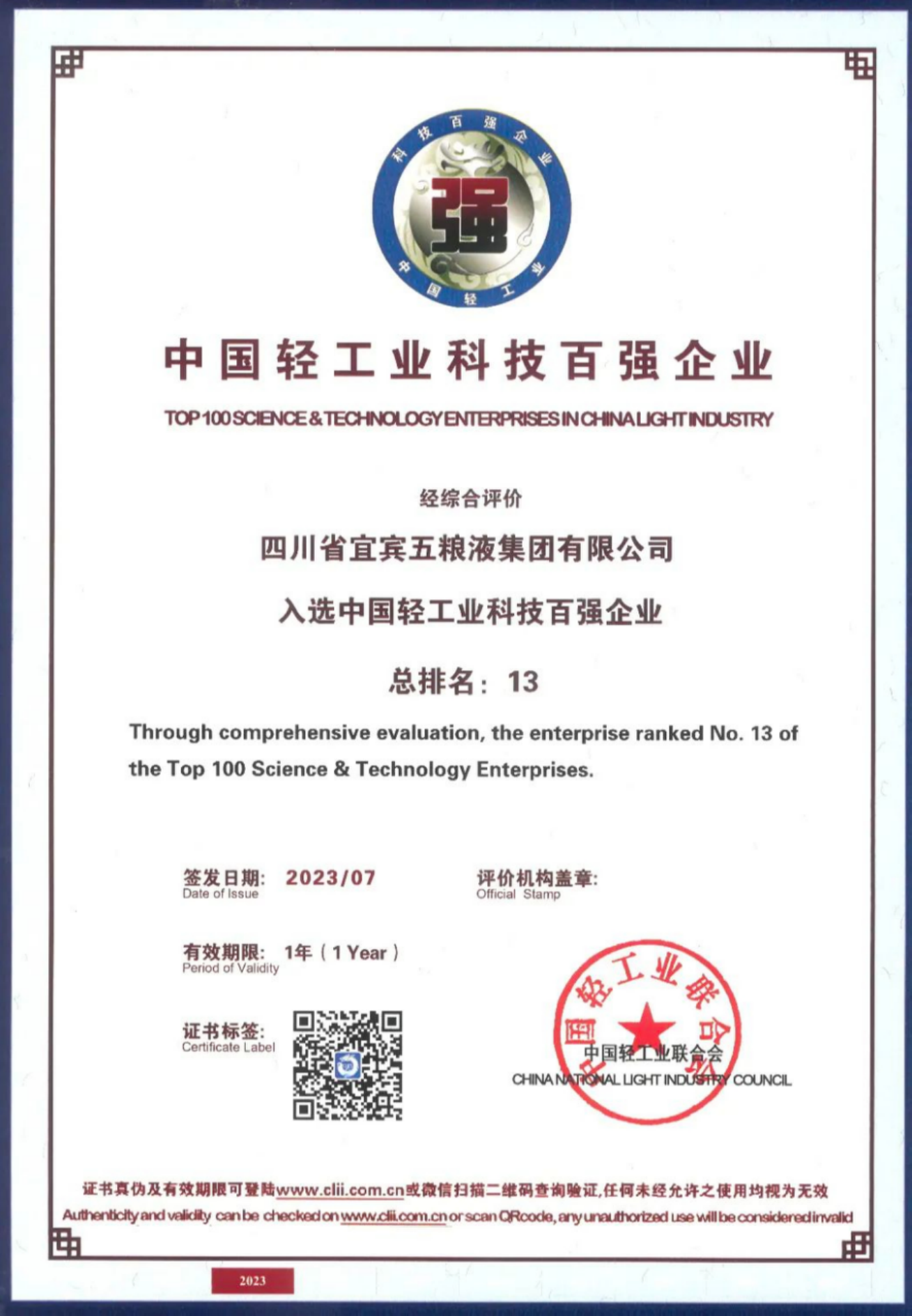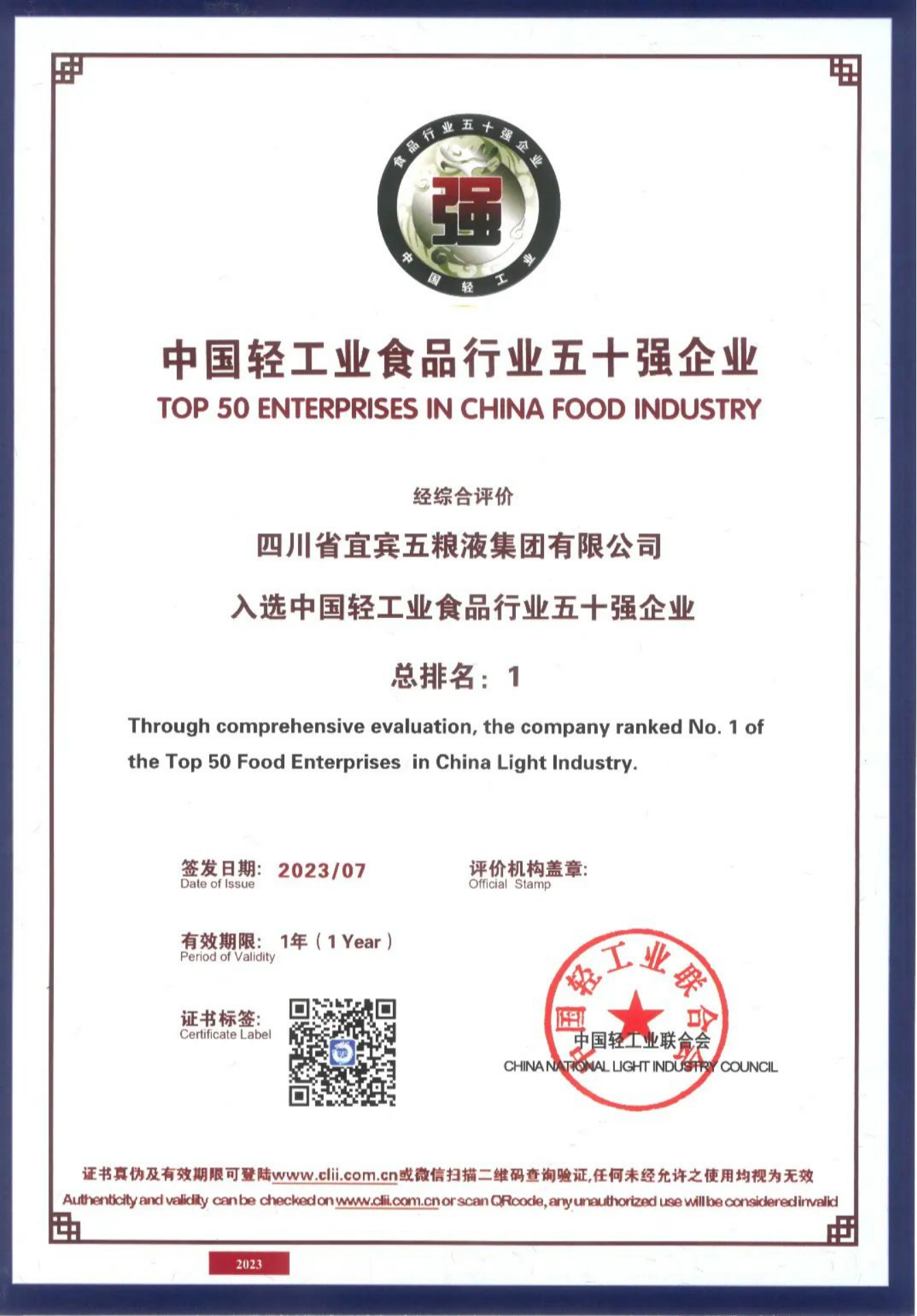 新華財經北京7月21日電(李耀威)7月20日,2023年中國輕工業百強企業高峰論壇在北京舉行,論壇上發布了2022年度“中國輕工業二百強企業”“中國輕工業科技百強企業”“中國輕工業食品行業五十強企業”“輕工裝備制造五十強企業”名單。五糧液集團以酒類行業最高分名列前茅,位居“中國輕工業食品行業五十強企業”首位、“中國輕工業二百強企業”第四位、“中國輕工業科技百強企業”第十三位。