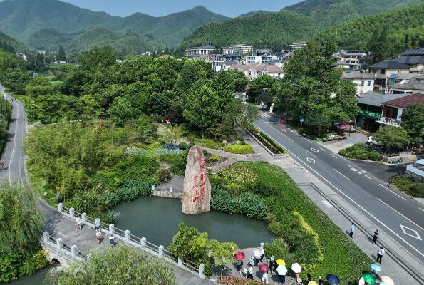 游客在浙江安吉余村村參觀(2023年8月11日攝,無(wú)人機(jī)照片)。新華社記者 翁忻旸 攝