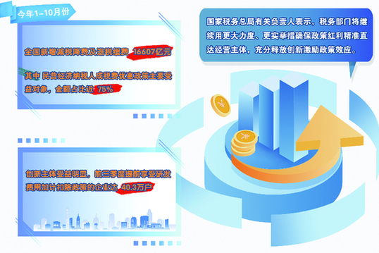 繼續對小規模納稅人減免增值稅、優化研發費用加計扣除政策、先進制造企業增值稅加計抵減……今年以來,相關部門分批次延續、優化和完善近70項稅費優惠政策,有力激發經營主體活力,提升創新發展動能。國家稅務總局最新數據顯示,今年1至10月份,全國新增減稅降費及退稅緩費16607億元,其中民營經濟納稅人成稅費優惠政策主要受益對象,金額占比近75%;創新主體受益明顯,前三季度提前享受研發費用加計扣除政策的企業達40.3萬戶。