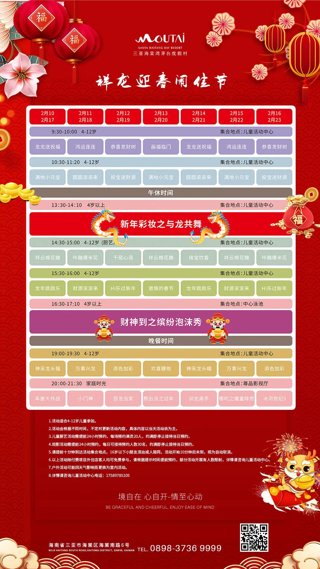 ????據悉,春節期間,茅臺度假村還將全天在酒店內的兒童活動中心、中心泳池、尊品影視廳固定開展“祥龍迎春鬧佳節”主題活動,活動類別豐富、花樣百出,既有傳統文化體驗,更有親子歡樂互動,活動時間將持續至大年十五元宵節。