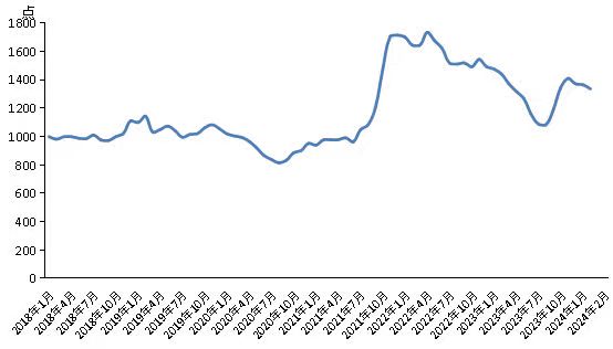 2月份,新華·中鹽兩堿工業鹽價格指數報1337.82點,較上期(2024年1月)下跌28.20點,跌幅2.06%;較基期(2018年1月)上漲337.82點,漲幅33.78%;較周期內最高點1736.66點(2022年4月)下跌398.84點,跌幅22.97%;較周期內最低點816.2點(2020年8月)上漲521.62點,漲幅63.91%。