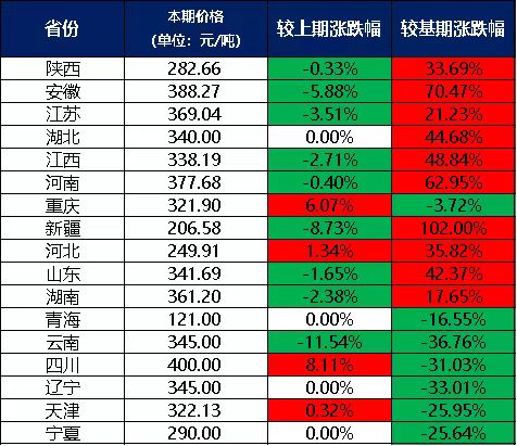 分價格區間來看,本期兩堿工業鹽單價在300元/噸以上的地區有12個,是安徽、江蘇、湖北、江西、河南、重慶、山東、湖南、云南、四川、遼寧、天津;兩堿工業鹽單價在300元/噸以下的地區有5個,分別是陜西、新疆、河北、青海、寧夏。