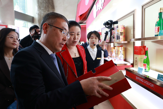圖為陜西西鳳酒股份有限公司總經理張周虎參觀產品展臺