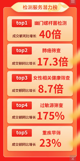 此外,肺癌篩查成交額同比增長超17倍,女性相關(guān)健康篩查成交額同比增長超8倍,就連被行業(yè)內(nèi)公認(rèn)不易取得突破的重疾早篩類項目,也取得23%的同比增長。