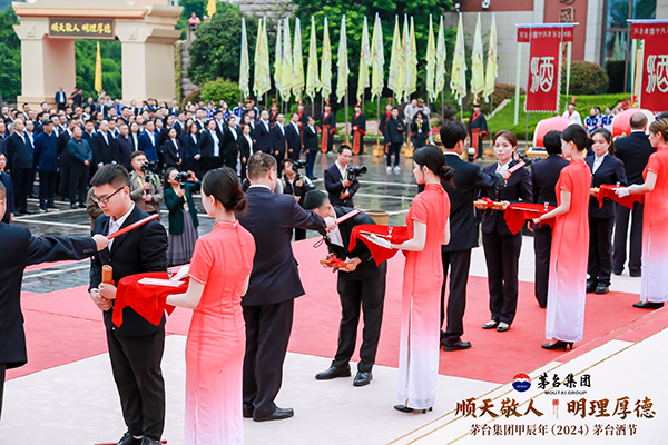 “金風浩蕩,天遠氣清。茫茫寰宇,旨酒其醇?!碑斕焐衔?時09分,在典禮司儀的誦讀聲中,茅臺集團甲辰年(2024)茅臺酒節正式拉開帷幕。