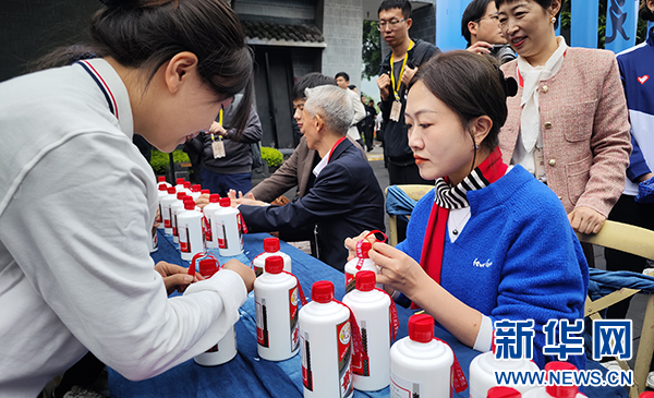 10月11日,參加茅臺酒節的嘉賓在茅臺中國酒文化城體驗茅臺栓絲帶。新華網 盧志佳 攝