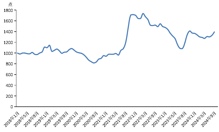 9月份,新華·中鹽兩堿工業(yè)鹽價格指數(shù)報1393.68點,較上期(2024年8月)上漲63.73點,漲幅4.79%;較基期(2018年1月)上漲393.68點,漲幅39.37%;較周期內(nèi)最高點1736.66點(2022年4月)下跌342.98點,跌幅19.75%;較周期內(nèi)最低點816.2點(2020年8月)上漲577.48點,漲幅70.75%。