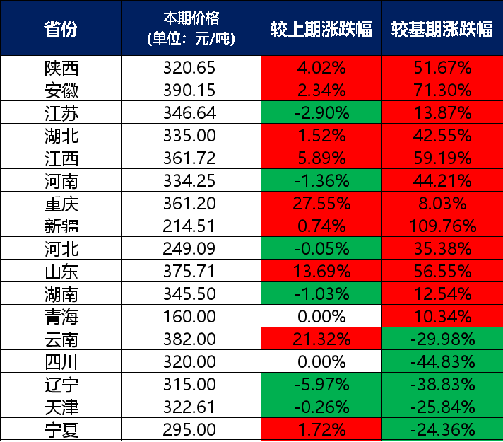 分價格區(qū)間來看,本期兩堿工業(yè)鹽單價在300元/噸及以上的地區(qū)有13個,是陜西、安徽、江蘇、湖北、江西、河南、重慶、山東、湖南、云南、四川、遼寧、天津;兩堿工業(yè)鹽單價在300元/噸以下的地區(qū)有4個,分別是新疆、河北、青海、寧夏。