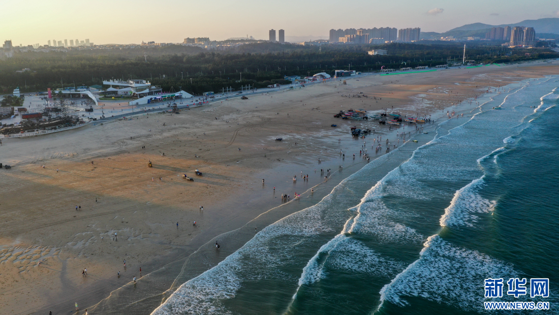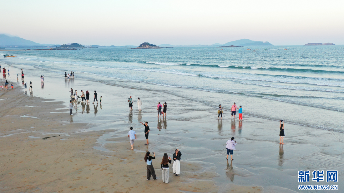 游客在沙灘上游玩,盡享落日海島風情(10月14日攝,無人機照片)。新華網 肖和勇 攝