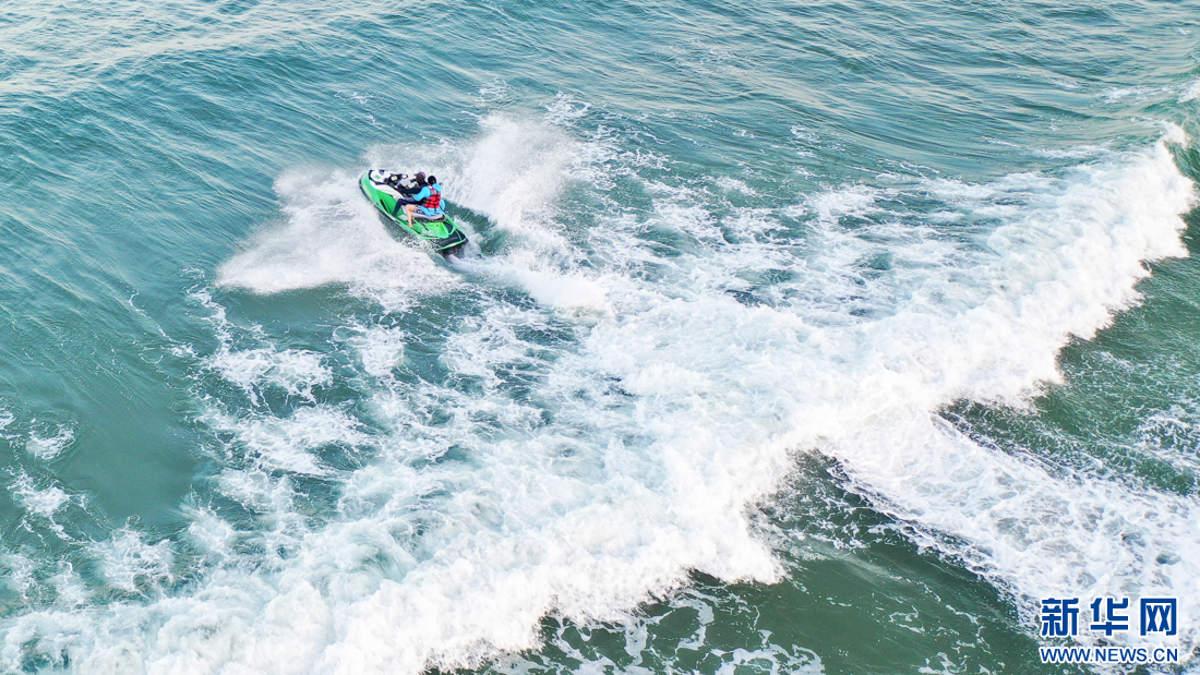 傍晚時分,游客乘船沖浪(10月14日攝,無人機照片)。新華網 肖和勇 攝
