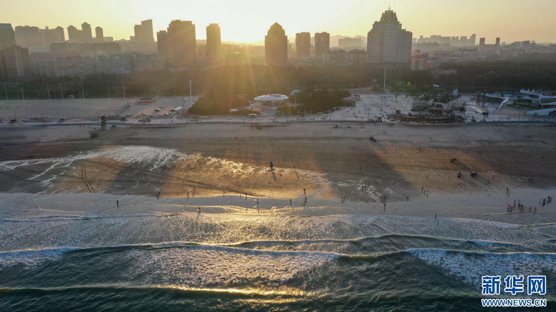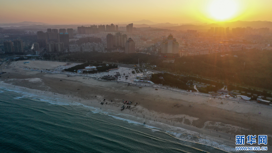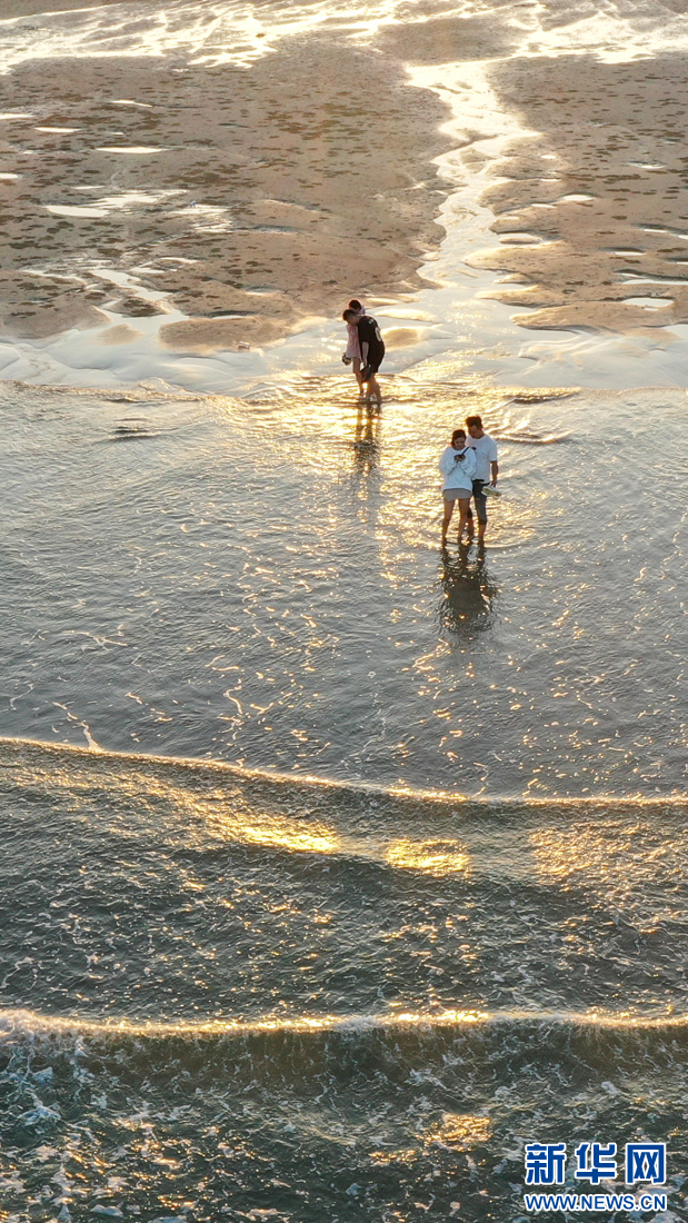 傍晚時分,游客在龍王頭海洋公園海灘游玩(10月14日攝,無人機照片)。新華網 肖和勇 攝