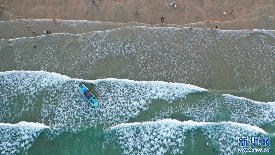 這是傍晚時分拍攝到的浪花、小船與游客(10月14日攝,無人機照片)。新華網 肖和勇 攝