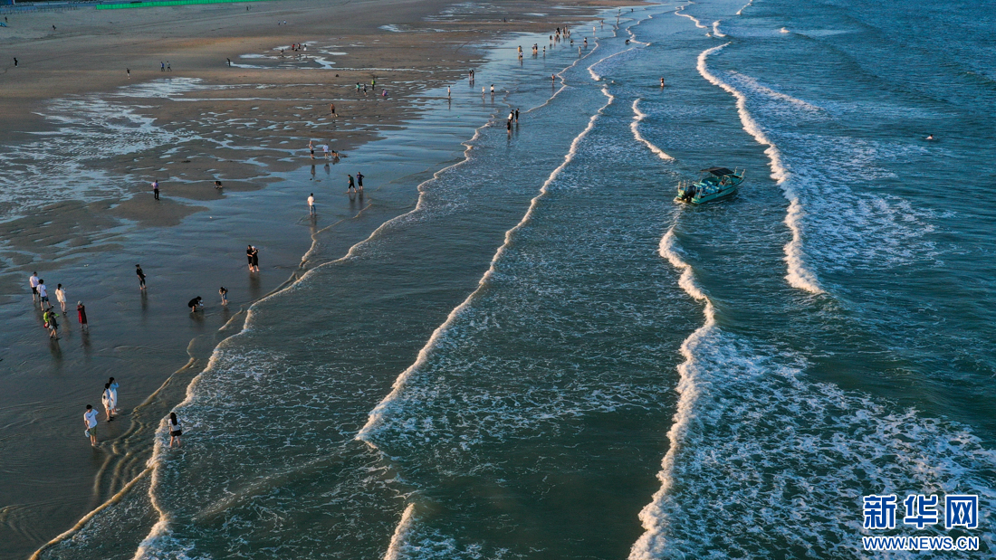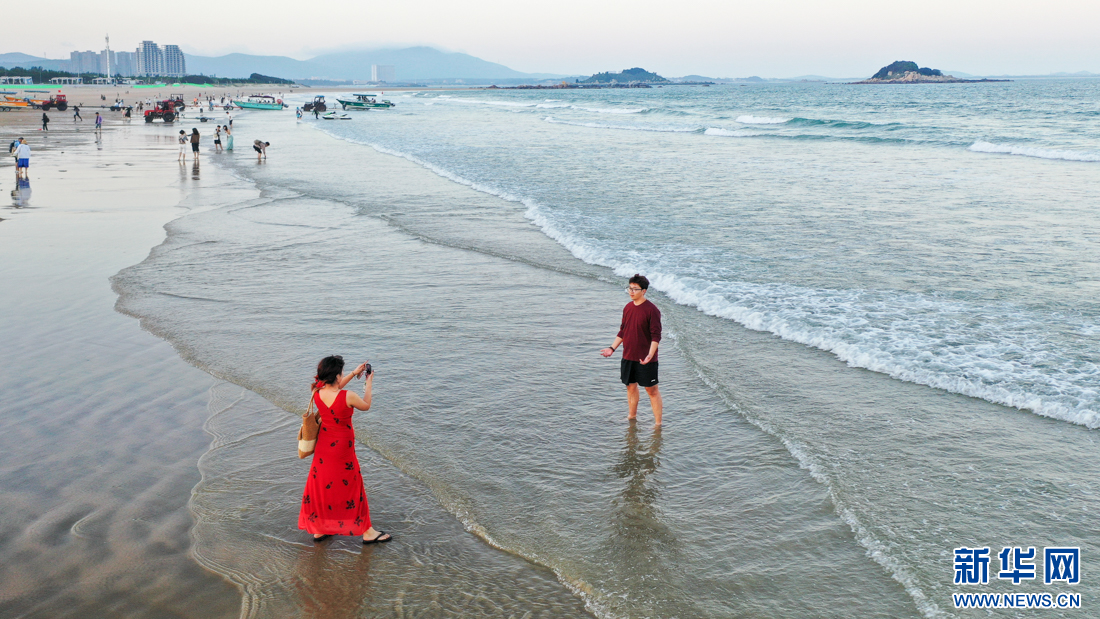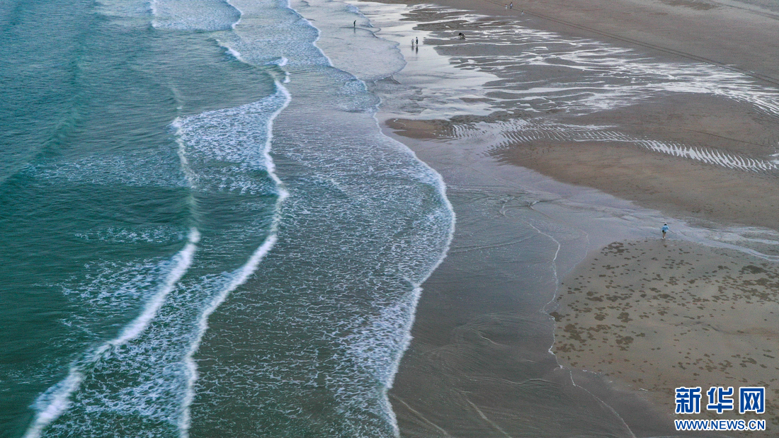 這是傍晚時分的龍王頭海洋公園海灘,涼風習習,浪花輕柔,游客流連忘返(10月14日攝,無人機照片)。新華網 肖和勇 攝