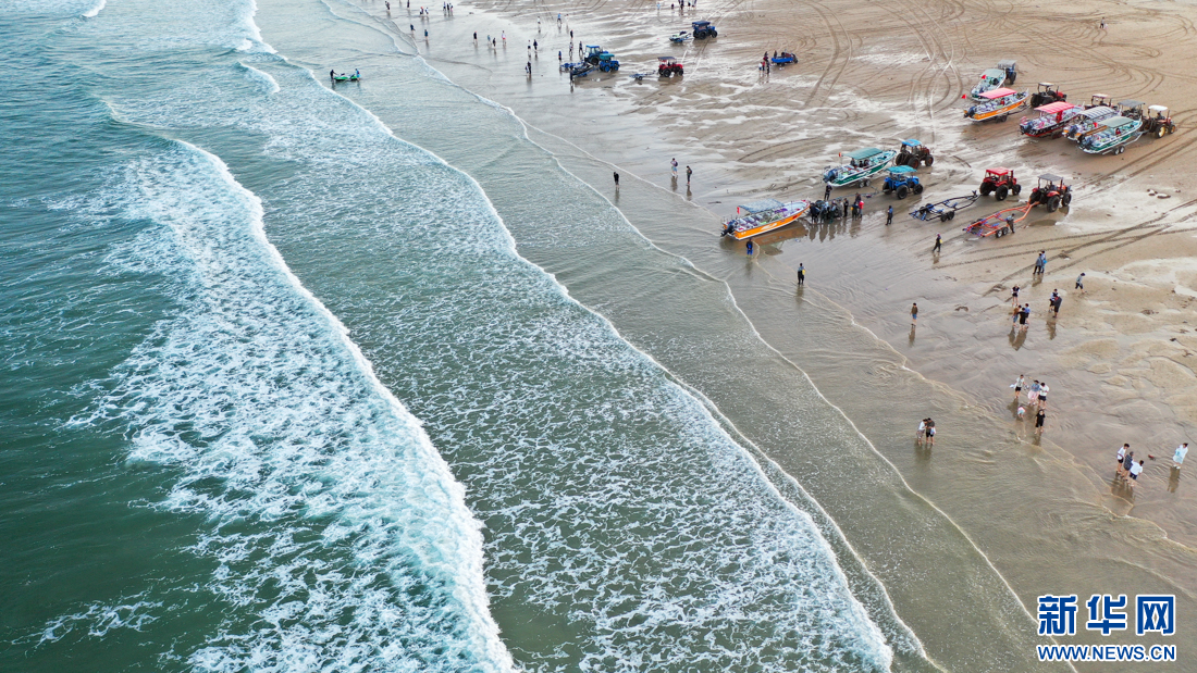 游客在金色沙灘上游玩(10月14日攝,無人機照片)。新華網 肖和勇 攝