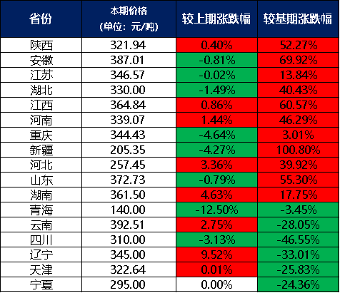 分價格區間來看,本期兩堿工業鹽單價在300元/噸及以上的地區有13個,是陜西、安徽、江蘇、湖北、江西、河南、重慶、山東、湖南、云南、四川、遼寧、天津;兩堿工業鹽單價在300元/噸以下的地區有4個,分別是新疆、河北、青海、寧夏。