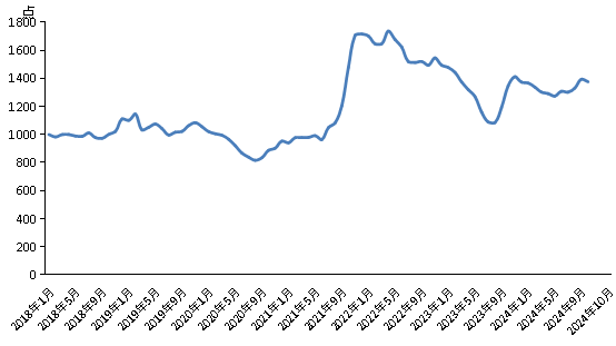10月份,新華·中鹽兩堿工業鹽價格指數報1375.48點,較上期(2024年9月)下跌18.20點,跌幅1.31%;較基期(2018年1月)上漲375.48點,漲幅37.55%;較周期內最高點1736.66點(2022年4月)下跌361.18點,跌幅20.80%;較周期內最低點816.2點(2020年8月)上漲559.28點,漲幅68.52%。