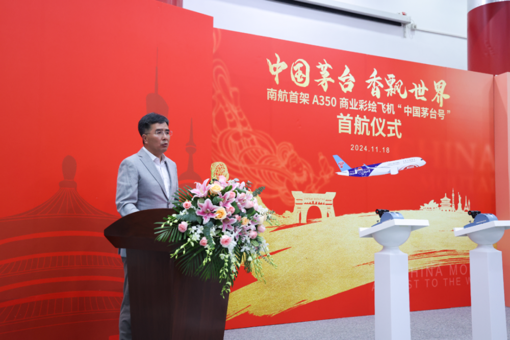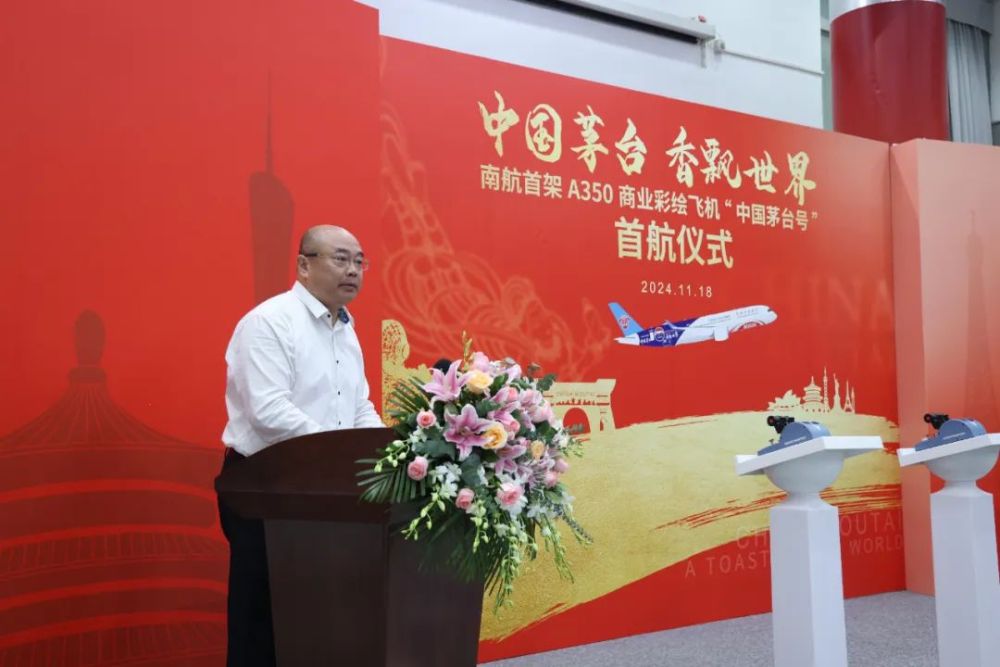 吳榕新在致辭中表示,南航與茅臺的合作不僅是兩個企業間的強強聯合,更是央企與地方國資企業合作的典范,這種合作不僅是資源的整合,更是優勢的互補,對于促進區域經濟的高質量發展具有重要意義。在西部振興的戰略背景下,央企與地方國資企業的合作尤為重要,此次“中國茅臺號”彩繪客機A350的啟航,正是央地合作、央企為西部振興助力的具體體現,不僅為茅臺品牌增添了一張靚麗的“空中名片”,也為南航集團的機隊增添了一抹獨特的色彩。未來,希望雙方繼續攜手,發揮各自優勢,進一步整合資源,共同做強做優做大,將“中國茅臺號”彩繪客機A350打造成為連接茅臺文化與世界各地的橋梁,讓更多旅客在飛行中感受中國品牌的獨特魅力與時代活力。