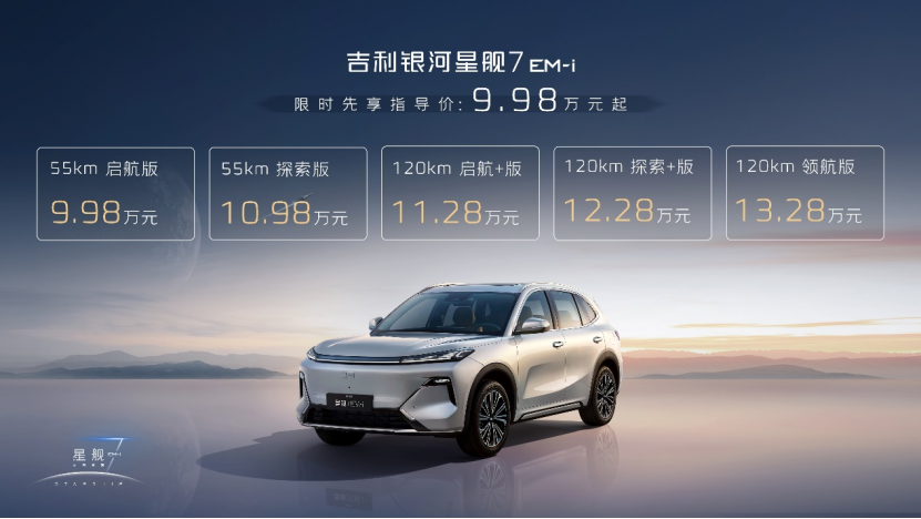 12月6日,吉利銀河全新A級電混SUV——“新一代國民精品SUV”吉利銀河星艦7EM-i(簡稱吉利銀河星艦7)在吉利汽車夢想啟航的地方——浙江臺州正式上市。新車共推出五個版型,分別是120km領航版、120km探索+版、120km啟航+版、55km探索版、55km啟航版,限時先享指導價為9.98萬元—13.28萬元。即日起,用戶可通過吉利銀河APP、微信小程序、抖音小程序及官網等官方渠道下訂,下訂用戶可享限時免費享價值8800元的Flyme Sound無界之聲、限時免費享價值1200-3000元配置、限時享8萬24期0息、不限品牌的4000元置換補貼等豐厚購車權益。