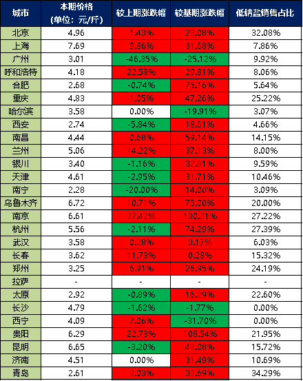 分價格區間來看,本期超市食用鹽銷售單價在5元/斤以上的城市有7個,分別是上海、蘭州、烏魯木齊、南京、杭州、貴陽、昆明;超市食用鹽銷售單價在4-5元/斤之間的城市有8個,分別是北京、呼和浩特、重慶、南昌、天津、長沙、西寧、濟南;超市食用鹽銷售單價在3-4元/斤之間的城市有6個,分別是廣州、哈爾濱、銀川、武漢、長春、鄭州;超市食用鹽銷售單價在3元/斤以下的城市有5個,分別是合肥、西安、南寧、太原、青島。