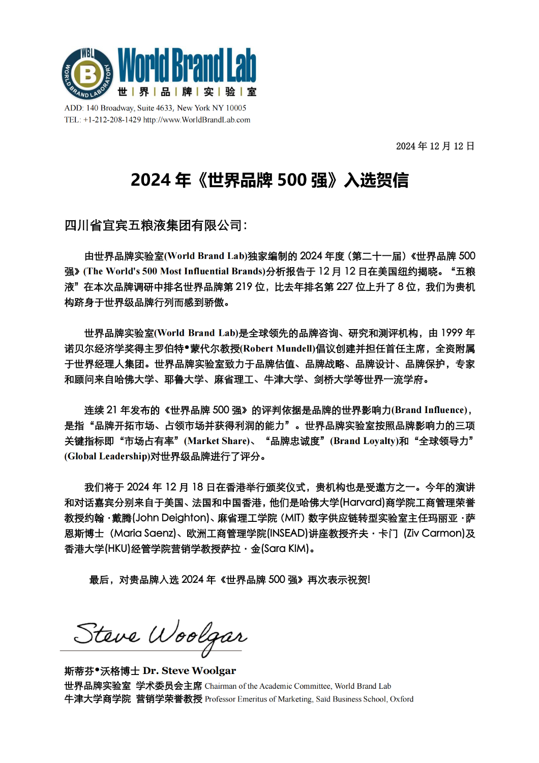 美國當地時間12月12日,世界品牌實驗室于美國紐約發布了2024年度《世界品牌500強》榜單。五糧液連續第八年榮登榜單,品牌排名增幅位居白酒行業第一。作為白酒領軍企業,五糧液以豐富形式持續提升品牌知名度和美譽度,不斷推動中國白酒文化的國際化傳播,加深全球消費者對中國傳統文化的理解與欣賞,成為中國品牌在國際舞臺的一張亮麗名片。