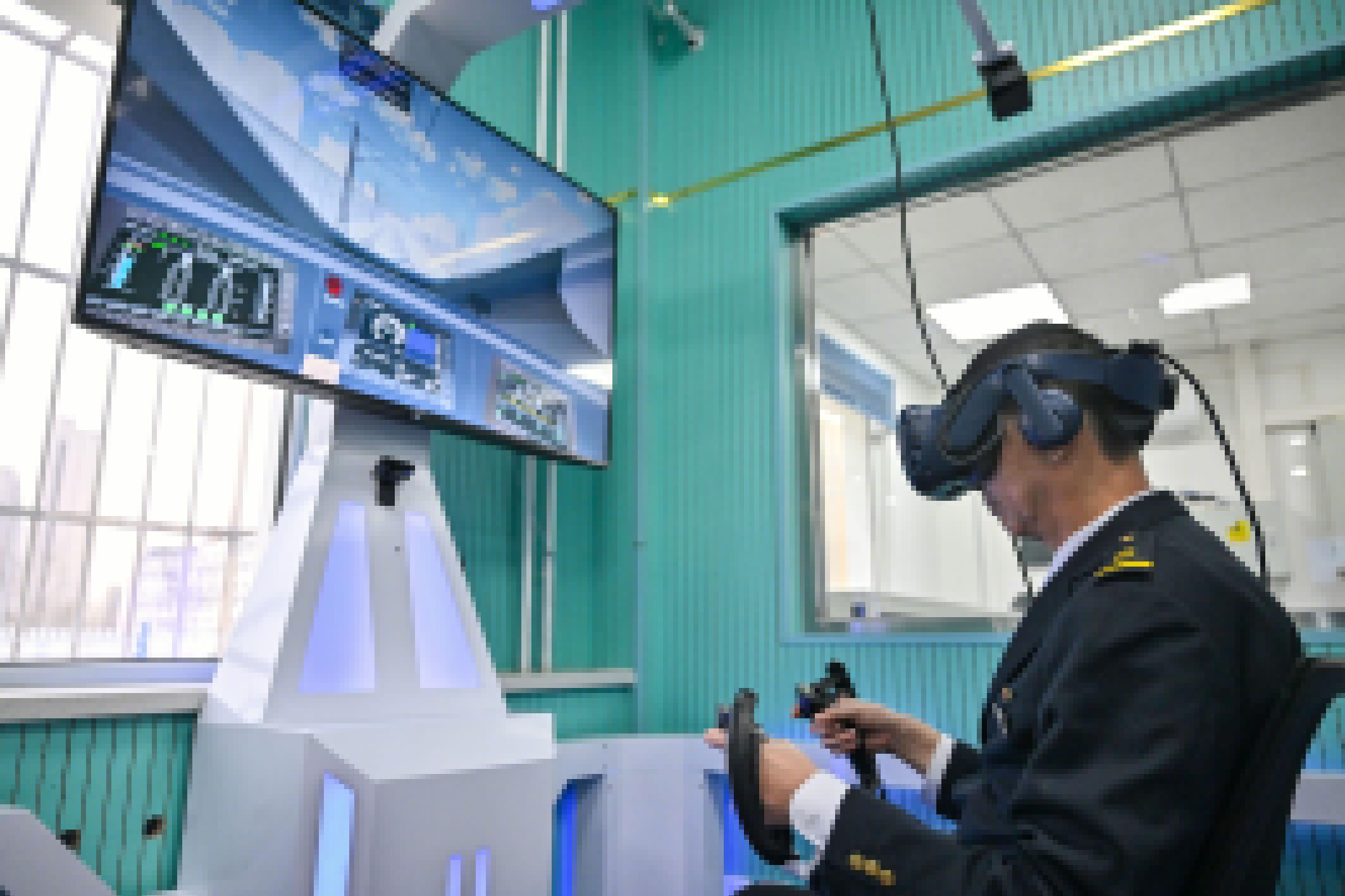 世界首條智能高鐵京張高鐵即將迎來通車五周年。據了解,通車近五年來,鐵路部門通過5G技術、北斗系統、智慧大腦、機器人檢修等各種科技手段,保障京張高鐵安全平穩運行。圖為近日在國鐵北京動車段北京北動車運用所,動車組司機安秀旗使用VR模擬駕駛設備訓練。