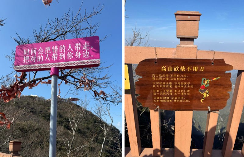 景區(qū)里的標(biāo)語標(biāo)牌,是人為制造“打卡點(diǎn)”的常見手法。張家界景區(qū)里沒有用“我在xxx很想你”之類的套話,而是根據(jù)景點(diǎn)特色用心擬了標(biāo)語,俏皮詼諧又勵志,就像同行的朋友在給登山者打氣。圍欄上懸掛著民歌、民謠和傳說故事,讓人歇腳的時候還能念上一段、唱上兩句。道旁植物上也掛著醒目的科普標(biāo)牌,行走在植物資源豐沛的山間,就像走進(jìn)了一座植物博物館。