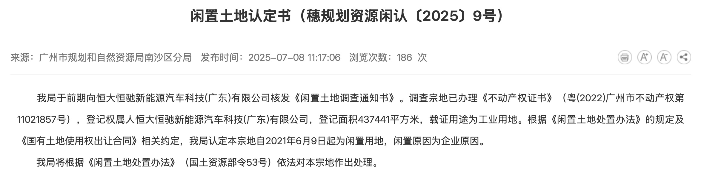 近日,廣州市規(guī)劃和自然資源局南沙區(qū)分局發(fā)布了一則《閑置土地認定書》,認定恒大恒馳新能源汽車科技(廣東)有限公司名下一宗工業(yè)用地為閑置用地。