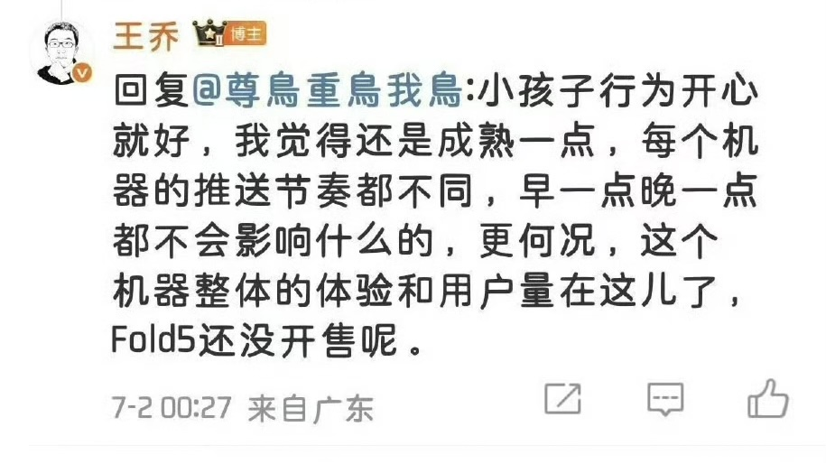 近日,vivo因高管不當言論陷品牌信任危機。據報道,vivo高端旗艦X200 Ultra用戶發現,同期發布的折疊屏機型Fold5已推送“經典正片/清透藍調”濾鏡功能,而售價7999元的Ultra機型卻被排除在外。對此,部分用戶在社交平臺質疑該產品維護策略不公。7月2日,vivo高管王喬在個人微博回復網友評論稱,(用戶訴求)是小孩子行為,開心就好,并表示每個機器的推送節奏不同,認為(用戶)還是成熟一點。