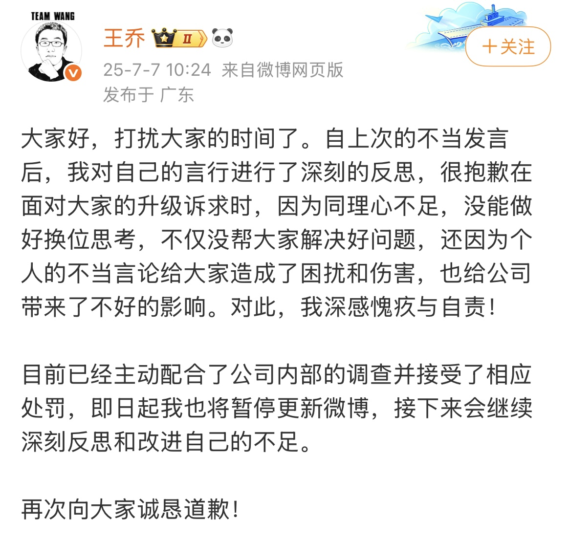 面對用戶的集體抗議,vivo于7月7日緊急向X200 Ultra推送OTA更新,補足缺失濾鏡功能。同時,王喬發布道歉聲明,承認“同理心不足”并宣布暫停微博更新,主動配合公司內部調查和接受相應的處罰。值得一提的是,王喬此前在X Fold3發布會直播事故中回應“臟水可以停了”已被批缺乏誠意。