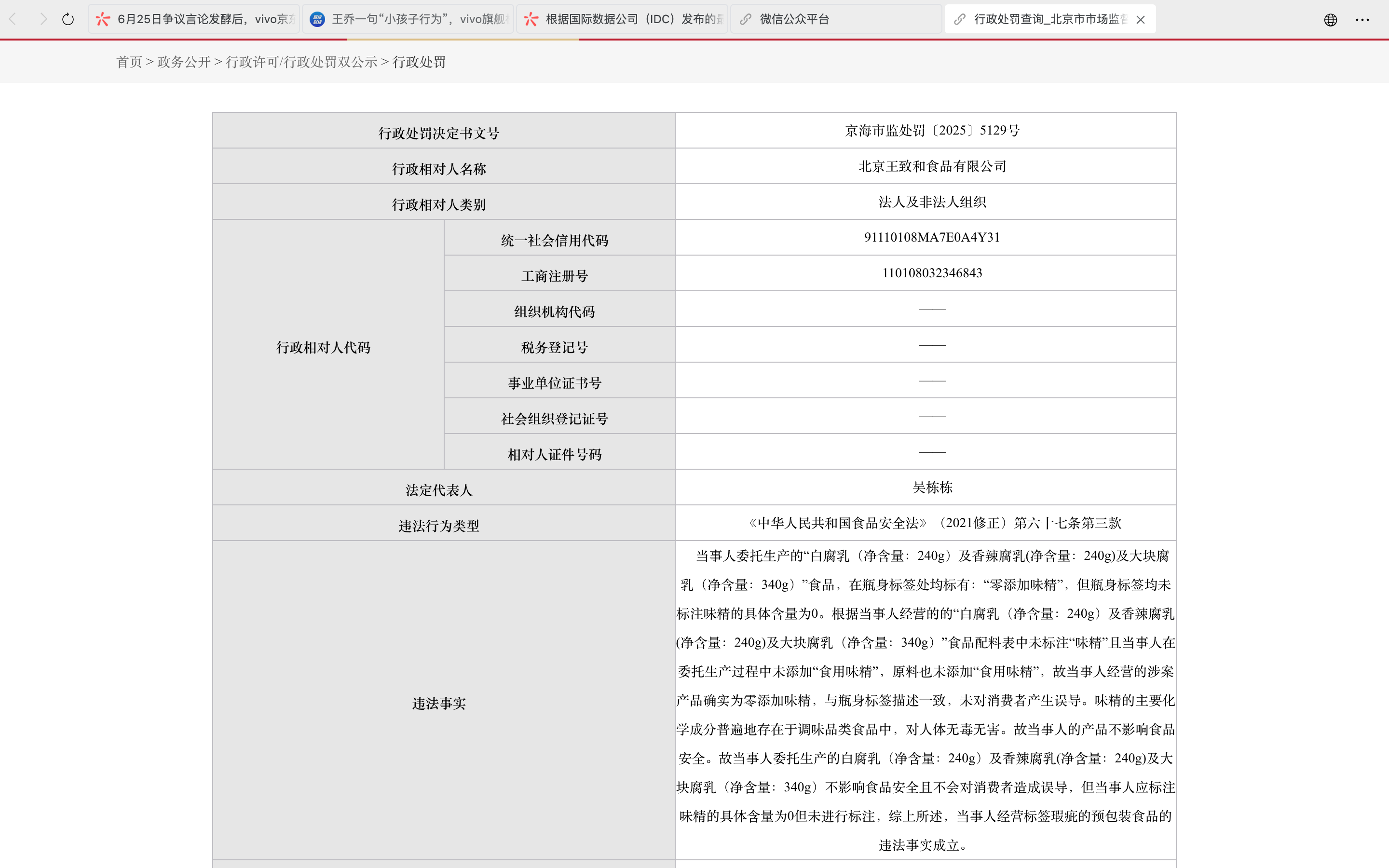 京海市監處罰〔2025〕5129號行政處罰決定書顯示,該公司委托生產的白腐乳(240g)、香辣腐乳(240g)及大塊腐乳(340g)瓶身標注“零添加味精”,但瓶身標簽均未標注味精的具體含量為0,依據《中華人民共和國食品安全法》第125條第二款規定,該產品經營瑕疵的預包裝食品的違法事實成立,已責令其改正上述違法行為。