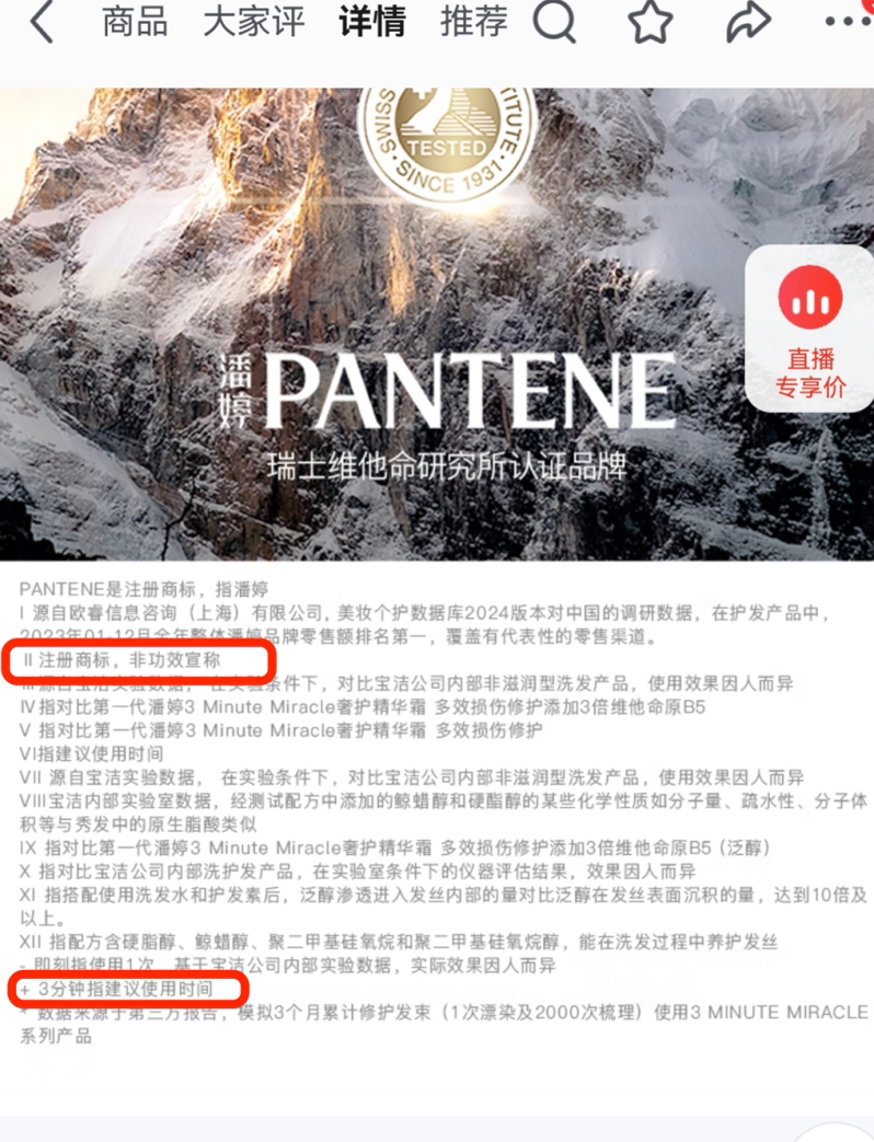 《經濟參考報》記者在瀏覽京東平臺潘婷官方旗艦店發現,“潘婷3分鐘奇跡”系列產品,其瓶身正面分別印有“3 MINUTE miracle”和“潘婷3分鐘奇跡”的明顯標識。同時,其詳情頁的廣告語為“3分鐘修護三個月累積損傷”。但其瓶身背面和商品詳情頁底部均有小字顯示,“潘婷3分鐘奇跡”指注冊商標而非功效宣稱,“3分鐘修護三個月累積損傷”中的“3分鐘”指建議使用時間。