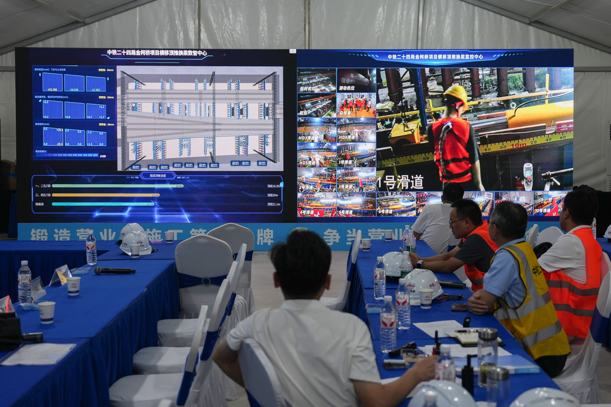 日前,在浙江紹興城際鐵路柯橋站施工現場,總重4000余噸的鋼箱梁應用人工智能(AI)技術順利實現精準落位,標志著在運營鐵路橋梁上嘗試應用AI技術換梁取得階段性成果,為我國既有鐵路改造升級提供了新方案。圖為工程技術人員在施工現場指揮部實時關注工程進展。