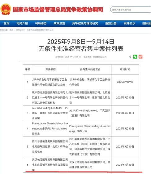 據國家市場監管總局網站9月23日發布的無條件批準經營者集中案件公示顯示,武漢長江國際貿易集團有限公司收購良品鋪子股份有限公司股權案已于9月10日審結。