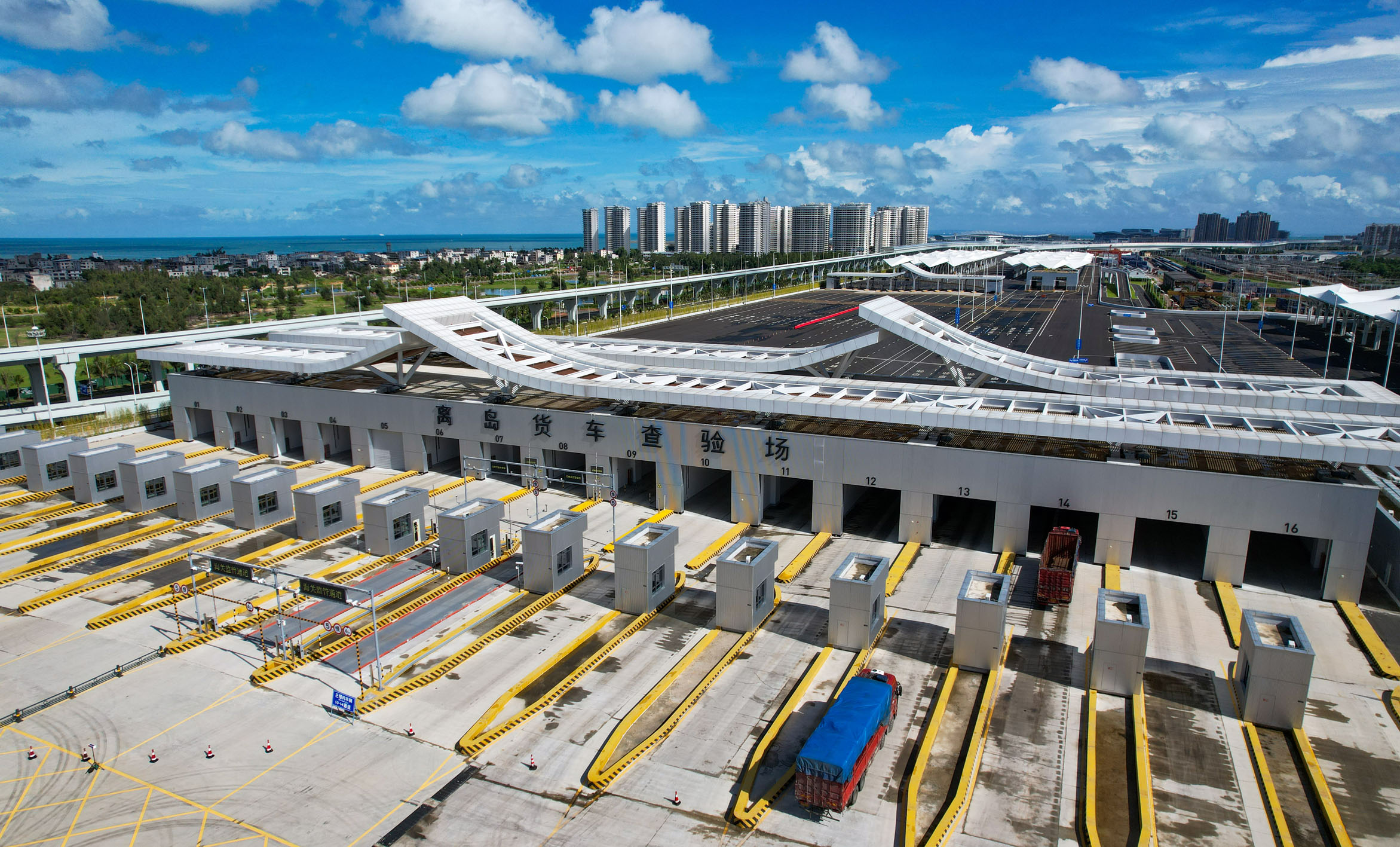 9月17日,離島貨車通過已正式試運行的海口新海港和南港“二線口岸”(貨運)集中查驗場,開往港區(無人機照片)。根據海南自由貿易港封關運作相關工作安排,自9月15日起,該集中查驗場作為新海港和南港貨車的統一出島通道。
