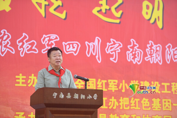 全國紅軍小學建設工程理事會執行理事長方強表示,今天,我們走進四川寧南,為全國500所紅軍小學之一的寧南朝陽紅軍小學授旗授牌,紅軍精神是新時代青少年成長的寶貴財富,紅軍小學已成為紅色教育的一面旗幟,希望孩子們以革命先輩為榜樣,學習紅色歷史,傳承紅色基因,爭做紅色傳人,讓紅色旗幟在校園高高飄揚。