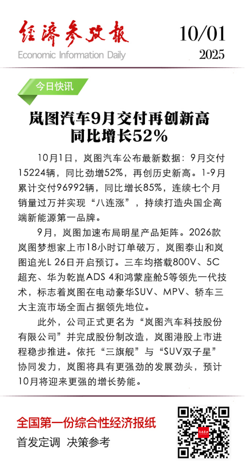 9月,嵐圖加速布局明星產品矩陣。2026款嵐圖夢想家上市18小時訂單破萬,嵐圖泰山和嵐圖追光L 26日開啟預訂。三車均搭載800V、5C超充、華為乾崑ADS 4和鴻蒙座艙5等領先一代技術,標志著嵐圖在電動豪華SUV、MPV、轎車三大主流市場全面占據領先地位。