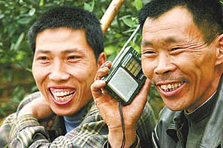 3月3日,重慶市永川區雙石鎮五龍橋村的村民在勞動間隙收聽全國政協開幕式。陳仕川
