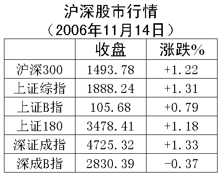 11月14日,經過此前多空雙方的激烈爭奪,深滬大盤終于止跌回升,基本扭轉了短期市場的頹勢。早盤開盤后股指先是短暫回探,但很快就被工商銀行等銀行類個股拉起,摸高1887點后,又在鋼鐵板塊大幅調整的拖累下持續回落,最低觸及1841點。至尾市,在通信板塊及食品板塊的合力推動下再度展開反抽,最終兩市強勢收出紅盤,并以接近全天高位報收。