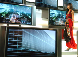 亞洲最大的國(guó)際家電展日前在日本千葉縣幕張國(guó)際展覽中心開(kāi)幕,世界807家公司展示了最新研制生產(chǎn)的等離子彩電、數(shù)碼照相機(jī)、數(shù)碼攝像機(jī)、DVD等數(shù)碼家電產(chǎn)品。圖為模特展示日本東芝、佳能公司共同開(kāi)發(fā)的高精細(xì)、高畫(huà)質(zhì)SED彩電。